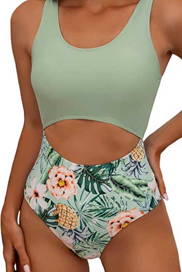 Green SheIn Women’s Tropical Print Scoop Neck Cut Out Tummy Control One Piece Bathing Suit